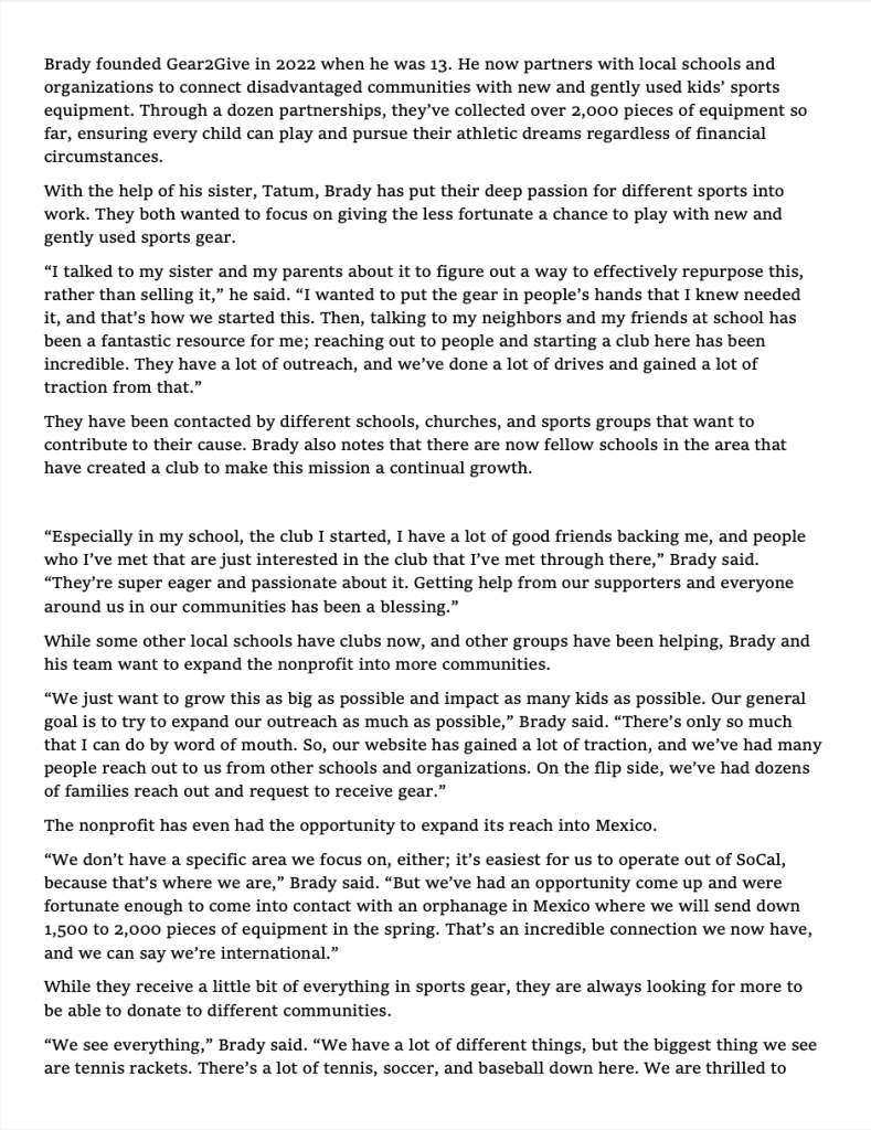 In March of 2025, Gear2Give was featured in the Capistrano Dispatch, a local newspaper that receives tens of thousands of views per month.