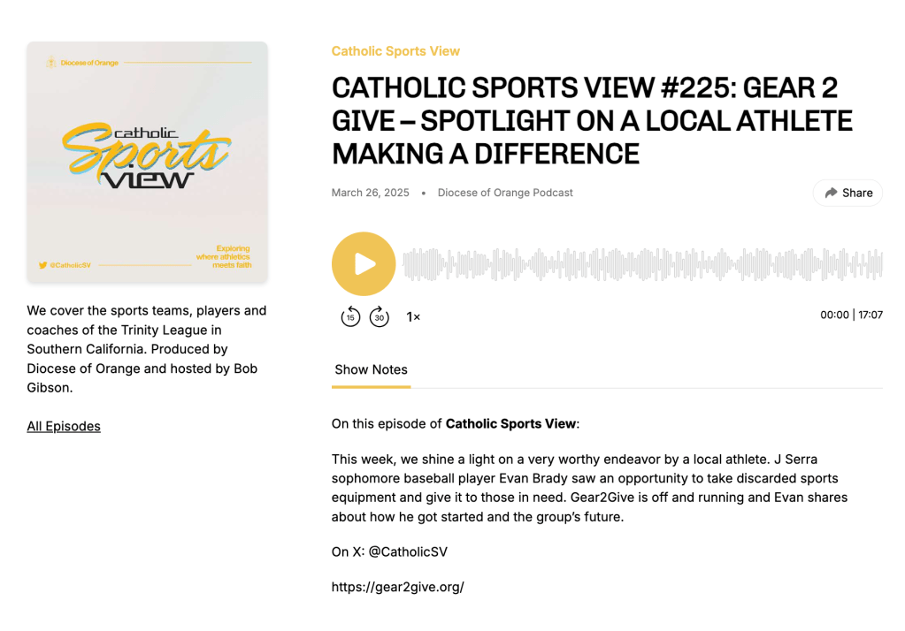 In March of 2025, Gear2Give was featured on the Catholic Sports View Podcast, hosted by Bob Gibson.