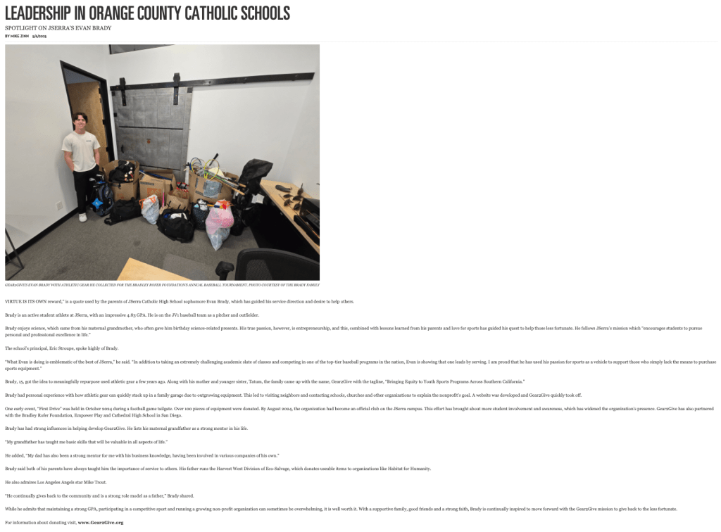 In May of 2025, Gear2Give was featured in the Orange County Catholic Newspaper, written by Mike Zinn.